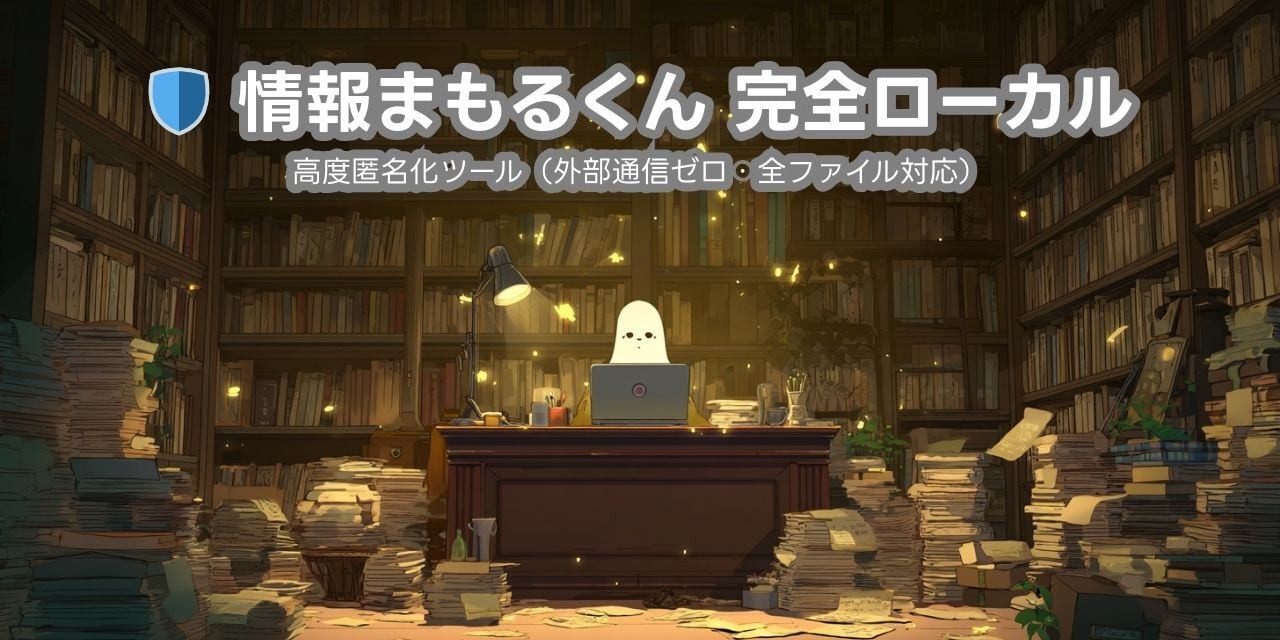 情報まもるくんは、入力したデータを外部サーバーに一切送らない、完全ローカル処理の匿名化ツールです。